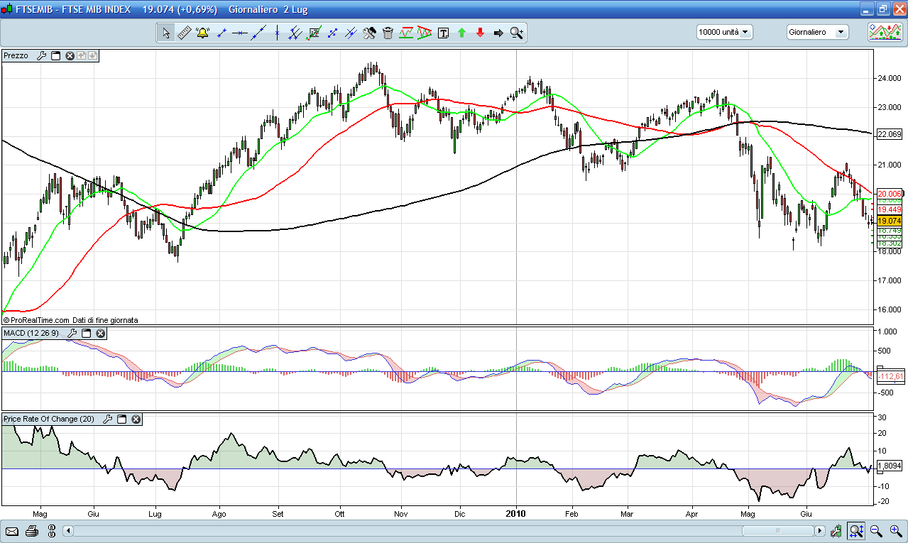 Per il listino italiano non ci sono novità rispetto al quadro delineato da alcuni mesi: il trend rimane negativo anche se sul breve notiamo un rafforzamento del MOMENTUM che potrebbe portare ad un momentaneo rimbalzo dei prezzi, mentre il MACD rimane negativo. Attenzione: sotto 18,000 punti aperture nuove posizioni short con obiettivo 16,000 punti.