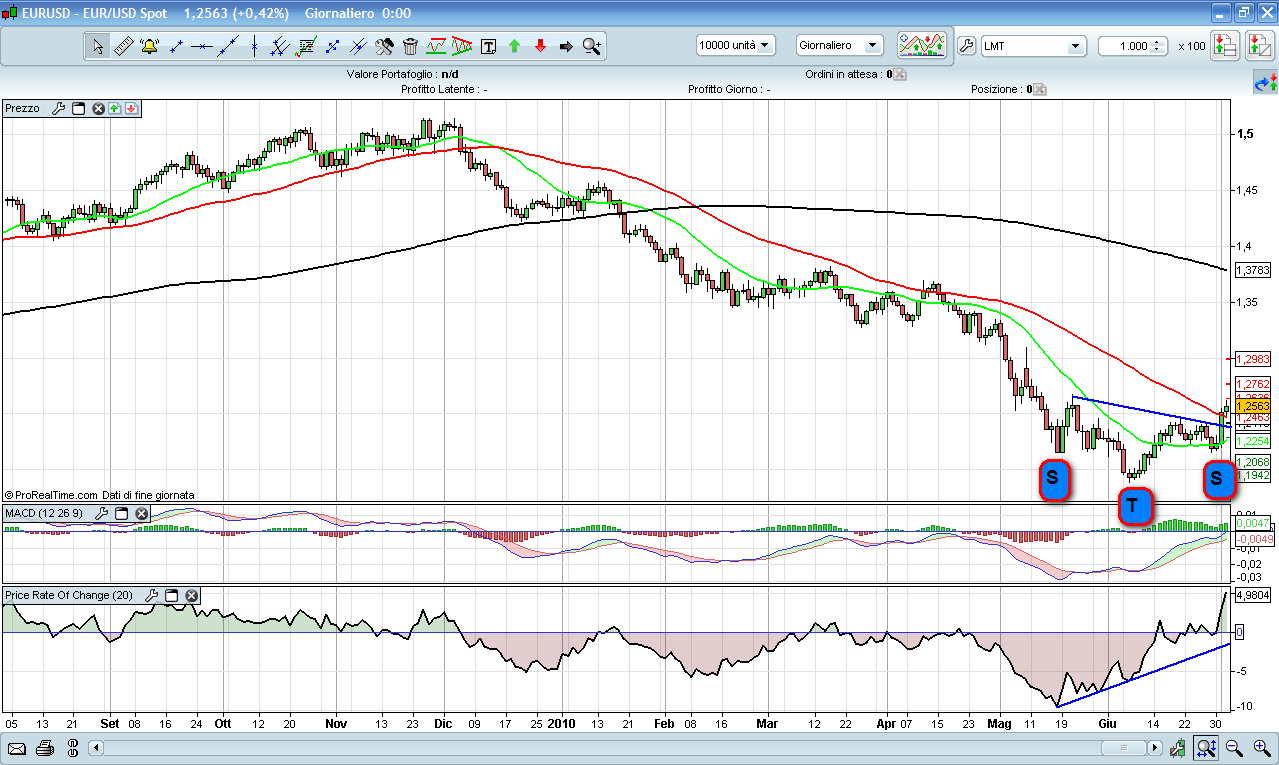 Forse è arrivato il momento per una virata rialzista del cross EURUSD….la formazione di un testa e spalle rialzista con coincidente rafforzamento del MACD e del MOMENTUM, ci porta ad individuare un primo obiettivo long in area 1,30. Ovviamente lo scenario di lungo periodo rimane negativo ma la situazione nel breve potrebbe dare un po’ di respiro ai prezzi.