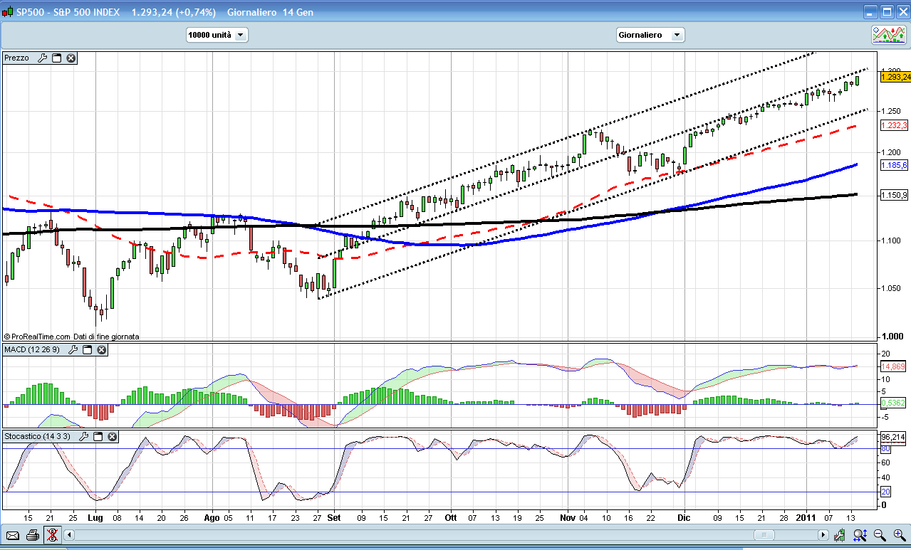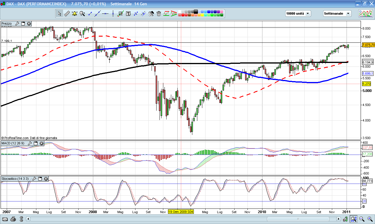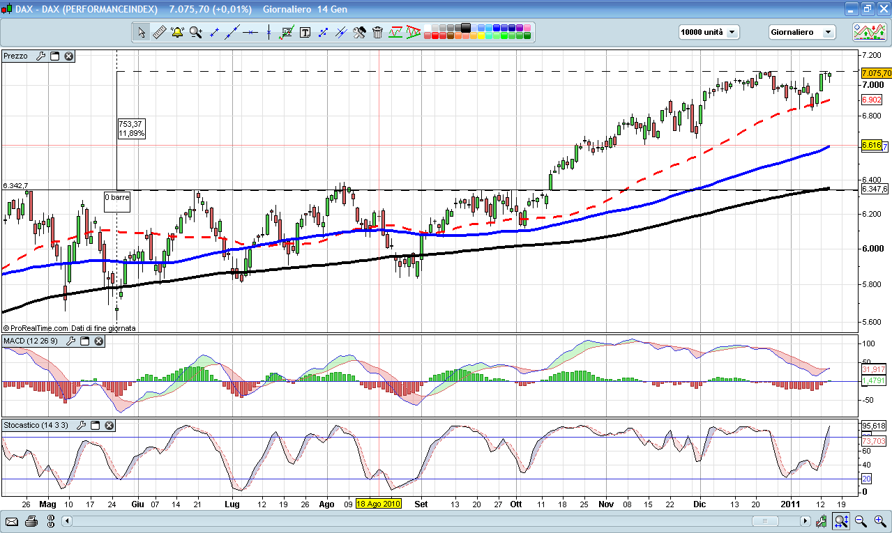 Nel breve periodo, dopo aver raggiunto l’obiettivo del grande triangolo rialzista formatosi tra giugno e settembre 2010 in area 7,000 (che già avevamo evidenziato tra luglio e agosto 2010), il DAX trova proprio la prima resistenza in area 7,076. Il superamento di tale livello aprirebbe un ulteriore fase rialzista verso area 7,230 (massimo relativo del maggio 2008). Al contrario un break out ribassista del supporto in area 6,840 ci farebbe pensare ad un ritracciamento del trend rialzista in essere fino ad area 6,680.lo stocastico comunque ci conferma la spinta rialzista in area 80, il MACD proprio in questi ultimi giorni è tornato a girare in positivo.