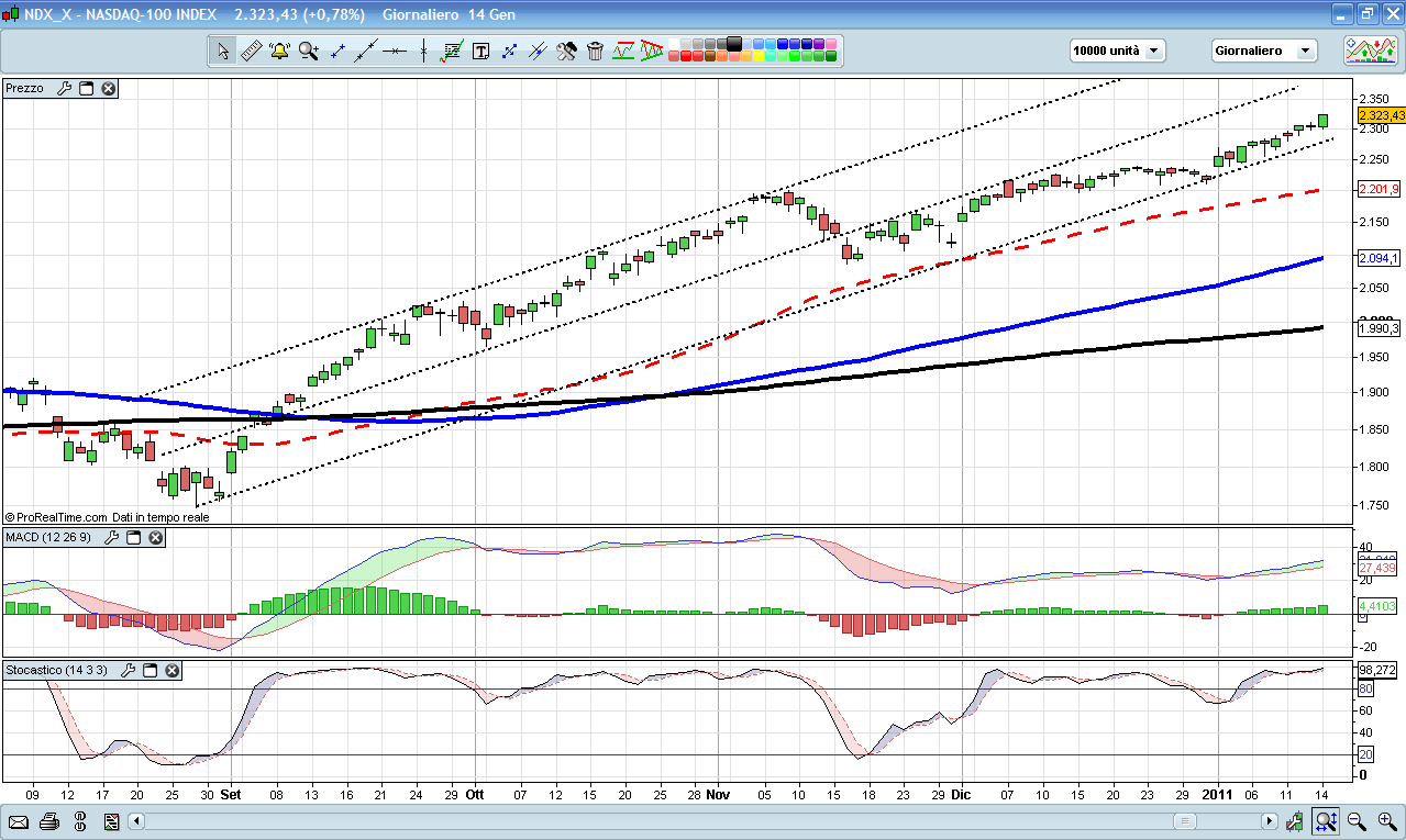 Anche per il listino tecnologico rimaniamo long, con conferme sia da stocastico che da MACD in forza positiva. Resistenza 2,380, supporto 2,290.