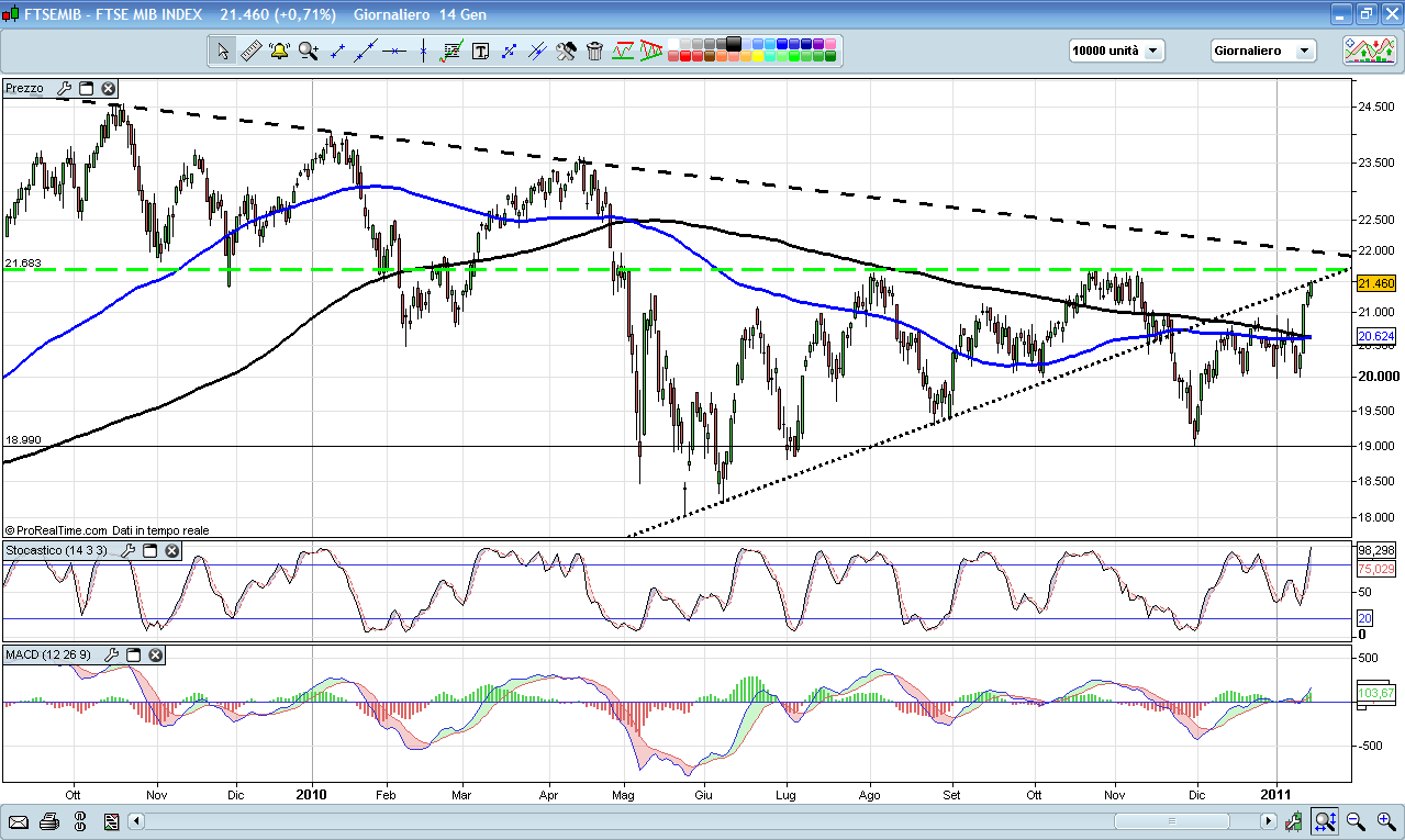 Dopo aver evidenziato la fascia di lateralità nella quale si era posizionato il FTSEMIB (tra 20,000 e 21,000 punti), notiamo come abbia rotto in maniera significativa proprio la resistenza in area 21,000. La prossima resistenza importante è posta in area 21,680 e poi 22,000 punti. Proprio quest’ultimo livello di prezzi rappresenta un importantissima resistenza di lungo periodo. Supporto in area 20,500 punti.