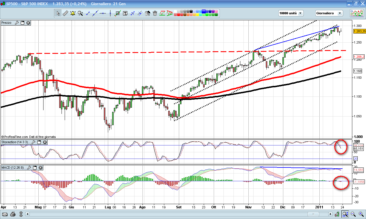 L’indice americano, nonostante si trovi all’interno di un canale rialzista, denota i primi segni di indebolimento del trend. Lo stocastico che abbandona la zona di 80 (ipercomprato) e il MACD che accentua la divergenza ribassista con i prezzi, ci fa pensare ad un probabile ritracciamento per la prossima settimana. 1,250 e 1,225 sono i primi supporti da considerare, mentre resistenza importante rimane area 1,300 punti.