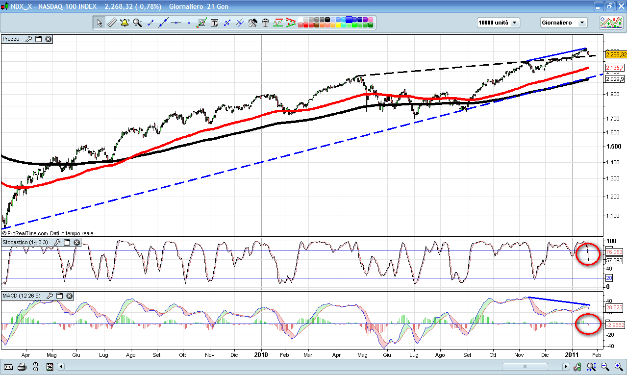 Anche l’indice tecnologico si trova inquadrato in ottica rialzista senza ombra di dubbio. Anche in questo caso la divergenza ribassista dei prezzi con il MACD e la debolezza dello stocastico che non sostiene più con decisione il trend rialzista, ci fanno pensare ad un imminente probabile ritracciamento dei prezzi. Consideriamo come supporto area 2,250-2,200 e resistenza area 2,330.