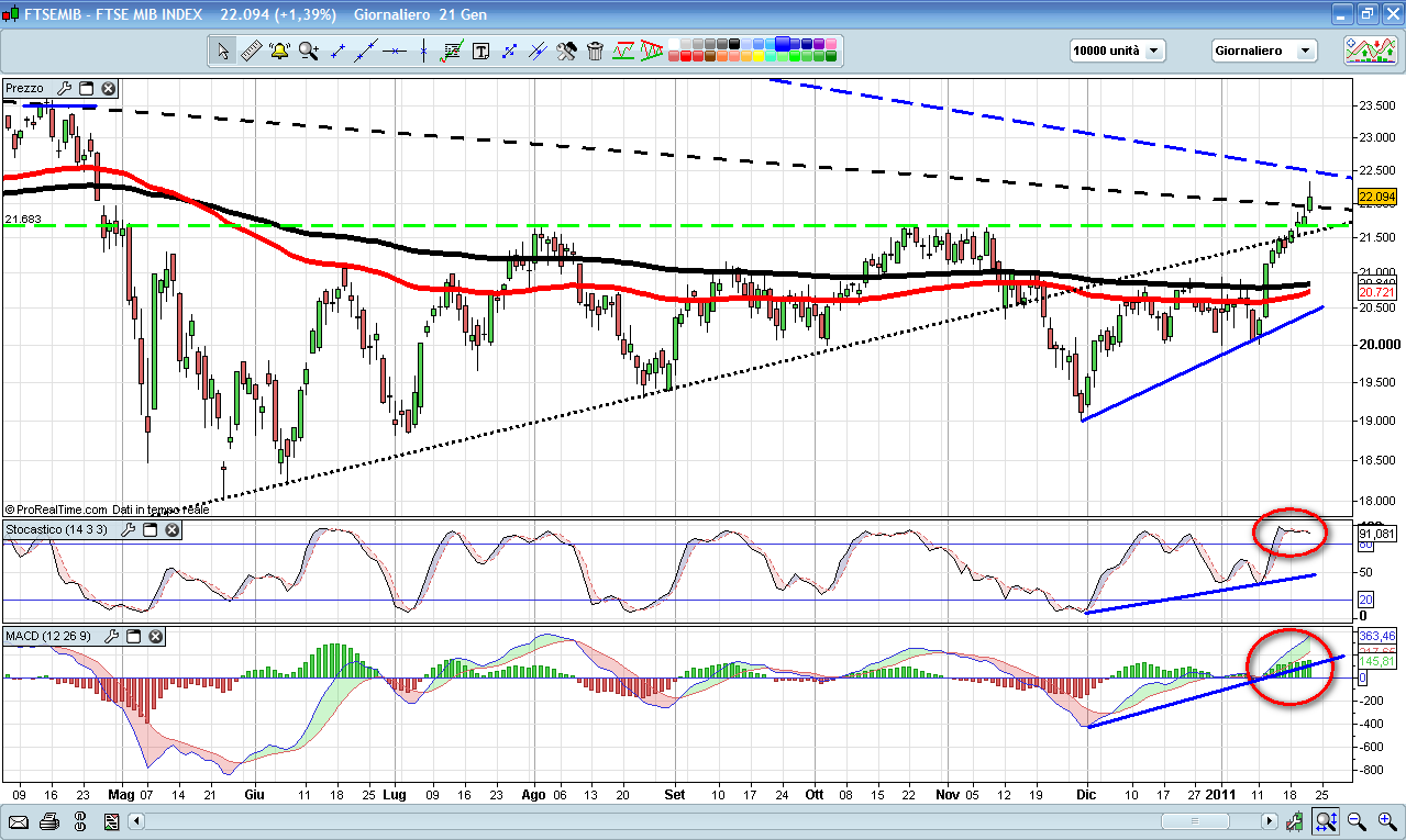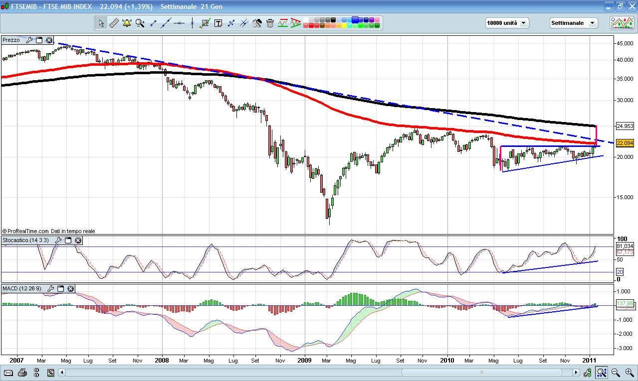 Soffermiamoci ora sulla situazione dell’indice italiano. Nel lungo periodo possiamo notare come i prezzi stiano testando come resistenza sia la MM 100 esponenziale sia la trendline ribassista tracciabile dai massimi del 2007. Lo stocastico e il MACD confermano la volontà del FTSEMIB di voler proseguire la corsa. Possiamo anche notare come la rottura rialzista della resistenza del triangolo ascendente creatosi da maggio 2010, abbia come obiettivo rialzista area 25,000 punti (livello importante dove troviamo anche la MM 200 settimane esponenziale). Nel breve teniamo come prima resistenza area 22,500 punti e supporto area 21,650. Stocastico e MACD confermano uptrend di breve.