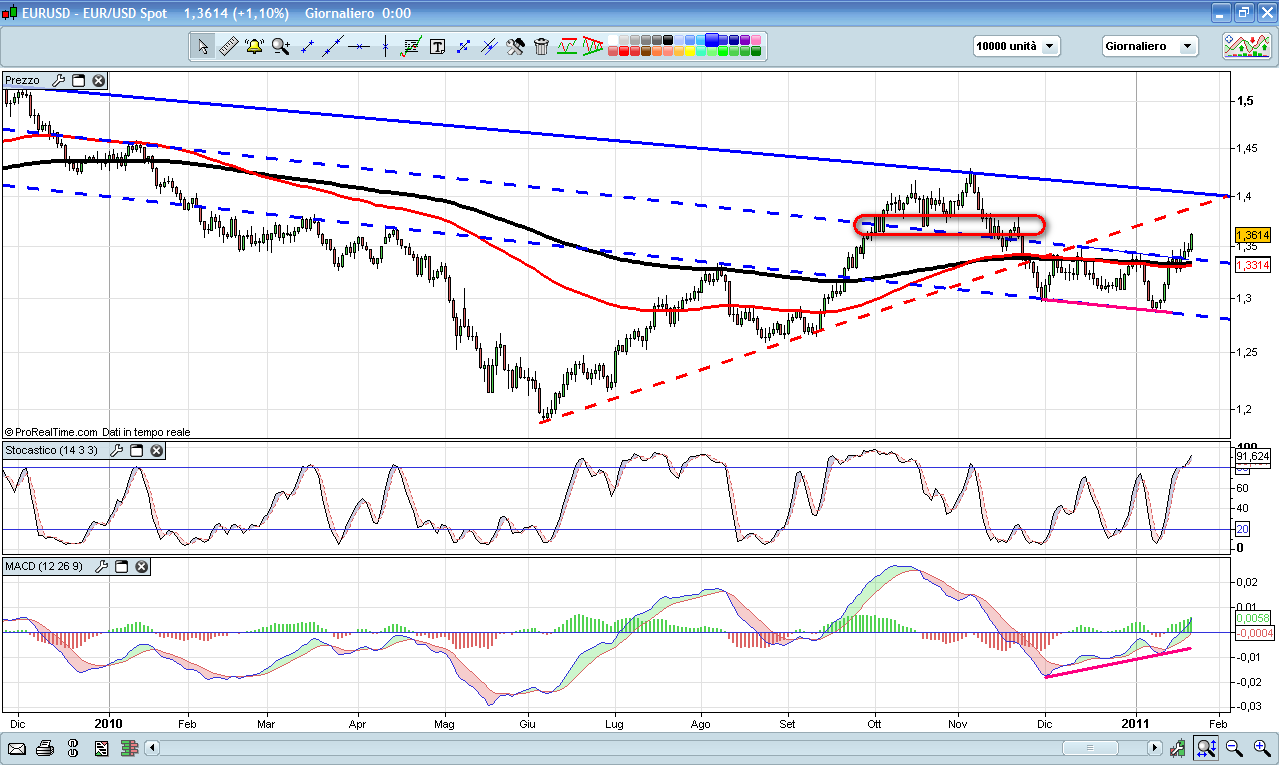 Il cross valutario sta vivendo una fase di grande recupero dopo mesi di pressioni ribassiste. Pur essendo inquadrato in ottica ribassista di medio termine, possiamo ipotizzare come primo obiettivo long area 1,3700-1,4000, e tenere come supporto area 1,3350. Il MACD e lo stocastico ci confermano la forza del periodo.