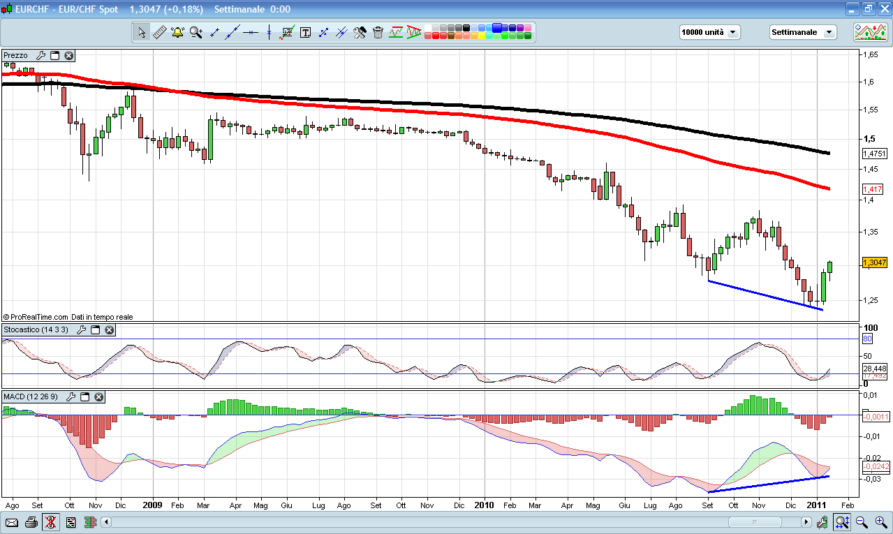 Anche questo cross valutario mostra segni di ripresa, dopo che per mesi è stato fortemente in trend negativo. Su grafico settimanale possiamo notare divergenza rialzista tra prezzi e MACD e stocastico che sta uscendo da area 20 dando forza alla partenza di un movimento positivo. Resistenza area 1,3500 e supporto in area 1,2500.