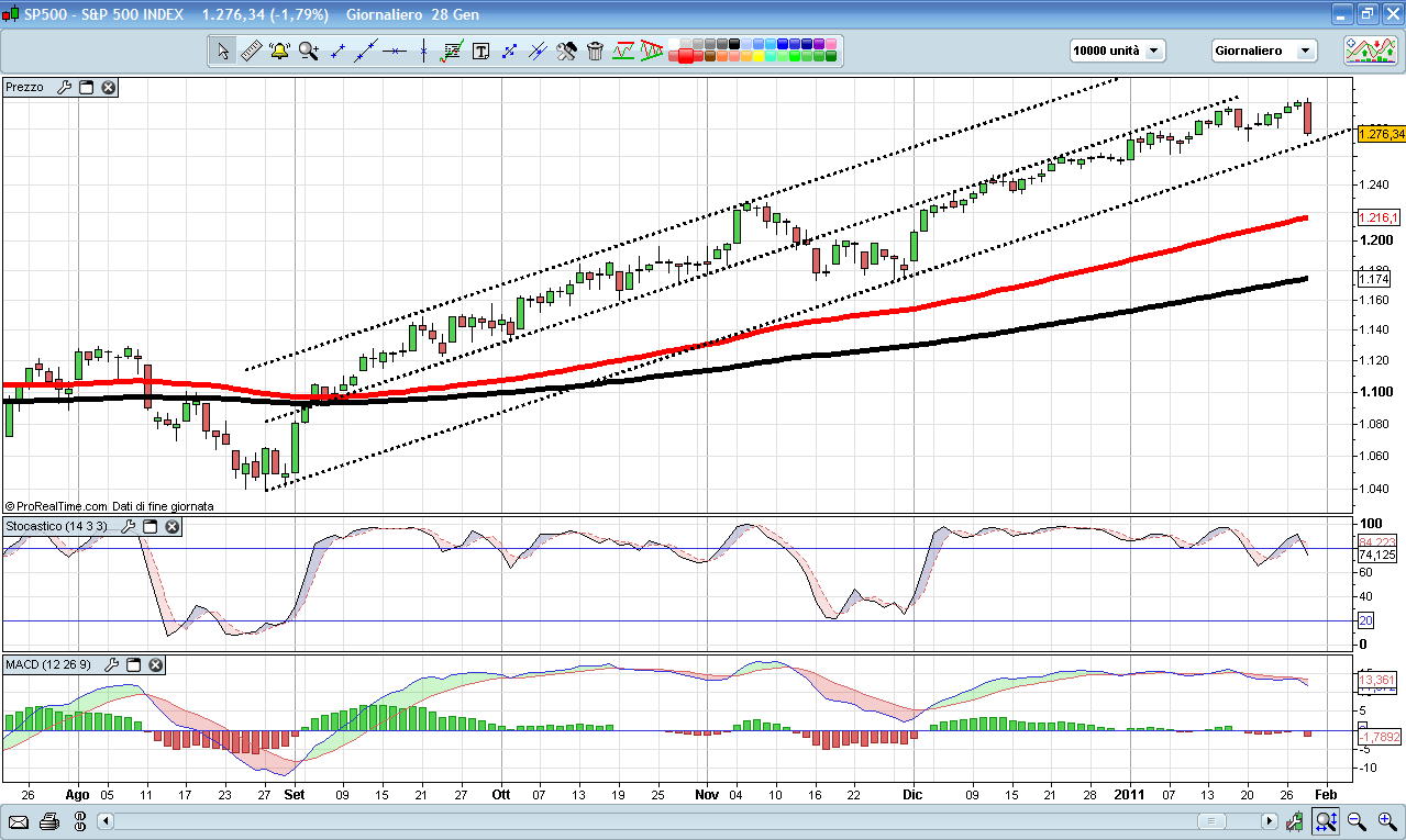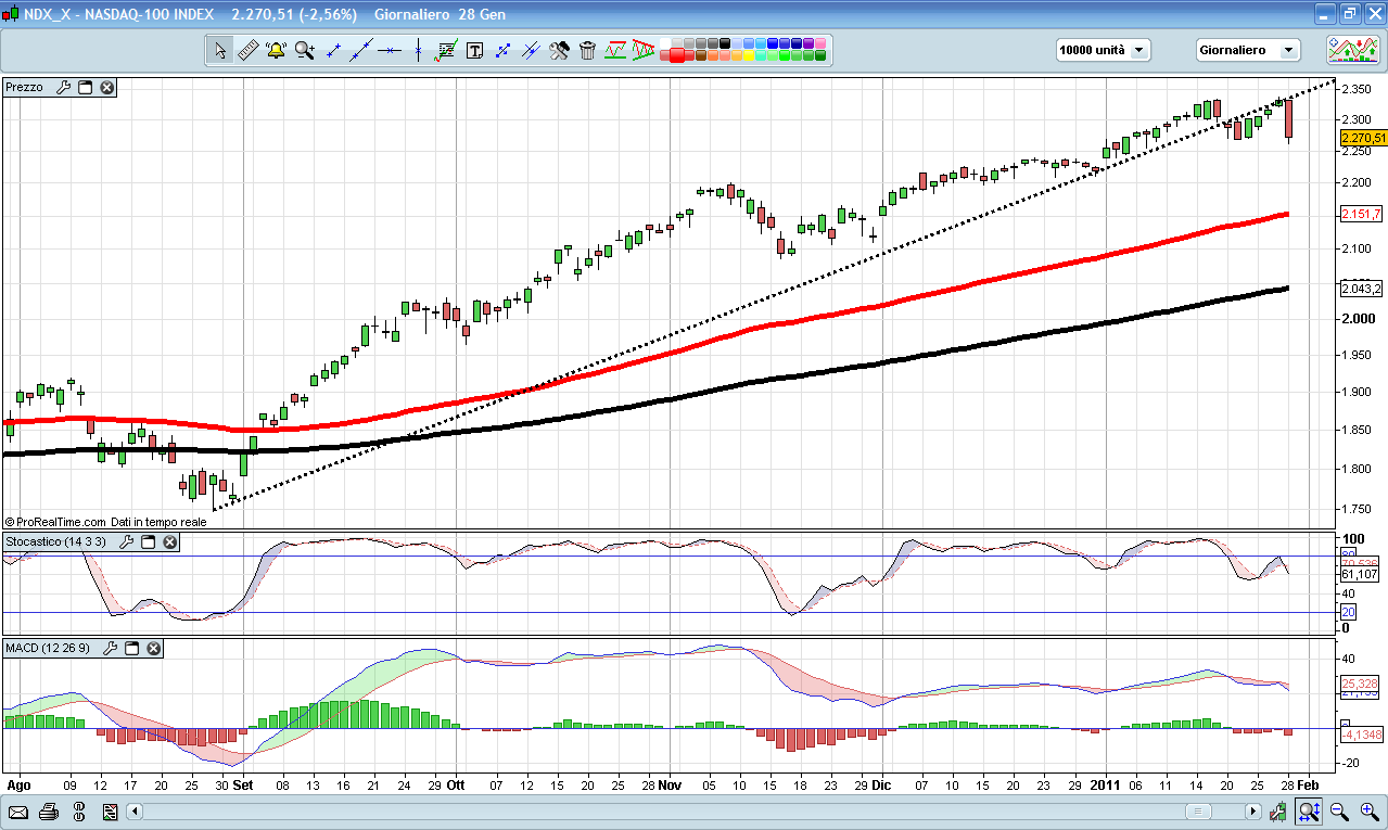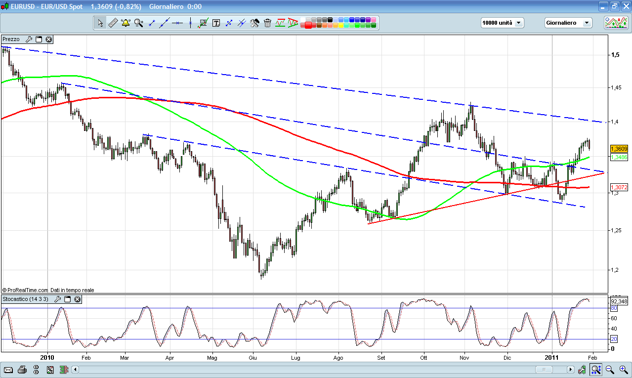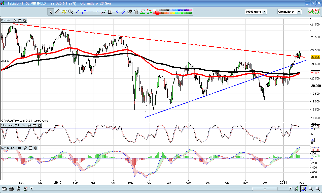 Preso il nostro obiettivo a 22,500 punti, ora l’indice italiano si trova a testare la trendline ribassista partita a novembre 2009. Chiaramente visibili sia i supporti che le resistenze. 21,650 il primo, 22,500 e successivamente 23,500 le resistenze. Se analizziamo i nostri due indicatori, notiamo che il MACD è in fase di indebolimento e l’oscillatore stocastico si trova in zona di ipercomprato oramai da una decina di giorni. Questa situazione ci porta a pensare che la trendline ribassista sia una forte resistenza da superare e addirittura potrebbe segnalarci la possibilità, qualora lo stocastico scendesse sotto gli 80, di aprire posizioni ribassiste per sfruttare un eventuale profondo ritracciamento. Le MM100 e 200 esponenziali in area 21.000 rappresentano un importante supporto dinamico.