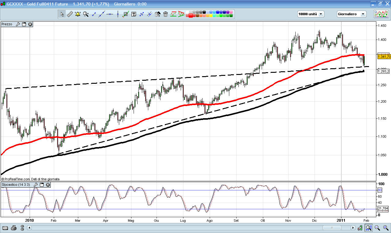 Interessante la situazione sull’oro che sta si sta appoggiando su importante supporto in area 1,310-1,300. La cosa interessante è che lo stocastico ci conferma che potrebbe essere finito il ritracciamento, e quindi nei prossimi giorni potremmo vedere una ripresa del trend rialzista. Fondamentale la tenuta di area 1,300.