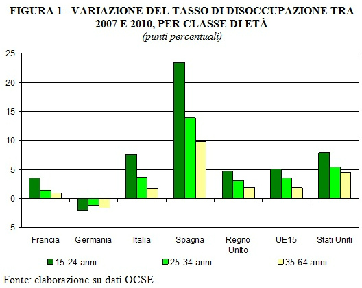 Nei 15 paesi che componevano l’UE fino al 2004, tra il 2007 e il 2010 il tasso di disoccupazione è aumentato di 5 punti percentuali nella classe di età 15-24, di 3,6 punti nella classe 25-34 e di 1,8 punti nella classe 35-64. Qualitativamente il profilo è simile in tutti i paesi, con l’eccezione della Germania; in Italia, come in Spagna, esso è più accentuato.