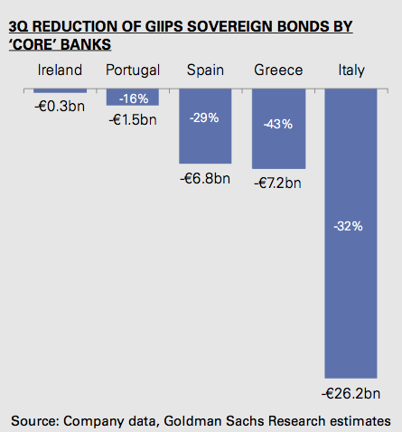 Tira brutta aria, amici miei. E a certificarlo ci ha pensato nel weekend, debitamente ripresa e amplificata dal New York Times, la solita Goldman Sachs, con un report alluvionale e terrorizzante sull’eurozona, corredato da una ventina di grafici che paiono usciti dall’anima nera di Edgar Allan Poe. Eccone uno visualizza quanto debito dei Giips (come sono politicamente corretti a Goldman Sachs, fremono per fare miliardi sul tuo collasso ma non vogliono offenderti chiamandoti Piigs) è stato scaricato dai mercati nel terzo trimestre di quest’anno.