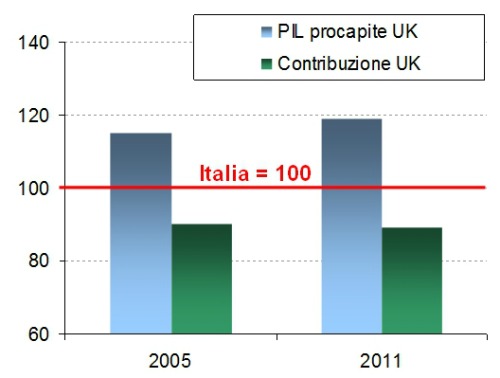 Questo sconto speciale per il Regno Unito è rimasto in vigore nel tempo, ma la motivazione non sembra essere più valida. La spesa per l’agricoltura è diminuita nel tempo e nel 2011 pesa per il 41,3%. Inoltre, la ricchezza per britannico è pari al 111% della media Ue. Se, per esempio, confrontiamo questi dati con quelli italiani vediamo che, fatto 100 il nostro Pil pro capite e il nostro contributo al bilancio dell’Ue, nel 2011 il Regno Unito ha contribuito l’11% in meno nonostante fosse il 19% più ricco (come si vede nel grafico più in basso). Valori che delineano una divergenza preoccupante se prendiamo gli stessi dati per il 2005.