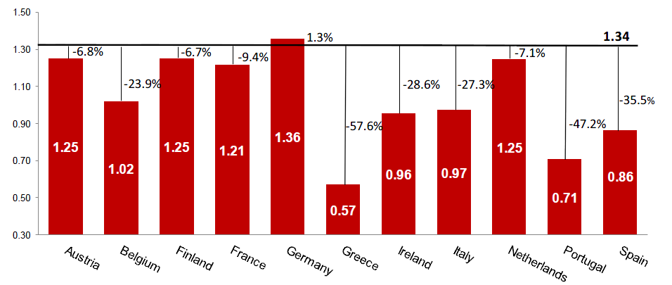 Il periodo di impatto maggiore è quantificato in cinque anni e le aree di criticità maggiormente analizzate sono il disallineamento dell’attuale tasso di cambio reale e i futuri rischi inflazionistici. L’Unione monetaria, infatti, per definizione ha disabilitato i normali aggiustamenti forex, quelli cioè che hanno vita sotto un normale regime di tassi di cambio flessibili. Date poi le rigidità nei prezzi nominali, specialmente in termini di disallineamento al ribasso dei salari, i reali tassi di cambio sono significativamente disallineate dai loro livelli di equilibrio in molte nazioni. Secondo, l’inflazione. Una rottura dell’eurozona significherebbe un ritorno a politiche monetarie indipendenti. Le banche centrali nazionali avrebbero quindi livelli di credibilità differenti nella lotta all’inflazione e dovrebbero affrontare vari gradi di pressione per fornire liquidità a banche e istituzioni pubbliche.