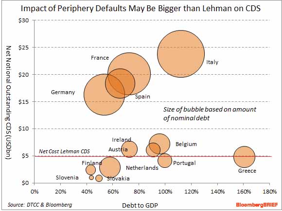 Ma torniamo ora alla stretta correlazione Italia-Francia e facciamolo parlando di cds, i famigerati credit default swap che potrebbero rivelarsi determinanti per spiegare nel medio periodo l’attacco speculativo sull’Italia. Questi strumenti finanziari vengono normalmente spacciati per contratti assicurativi, il problema è che lo sono rispetto al rischio di fallimento di una controparte di cui non si detiene proprietà o azioni. Ovvero, quando stipulo un’assicurazione su casa e automobile, ovviamente farò di tutto perché la casa non vada a fuoco e l’auto non venga rubata. Ma se è una terza persona a stipulare un’assicurazione sulla mia auto e la mia casa, potrebbe avere tutto il vantaggio e la volontà di appiccare il fuoco o far sparire il veicolo per incassare il premio su un bene non suo. E il valore nozionale dei cds sovrani italiani sul mercato superava i 28 miliardi di dollari lo scorso 8 ottobre, cinque volte il costo della bolla generata dal fallimento di Lehman Brothers.
