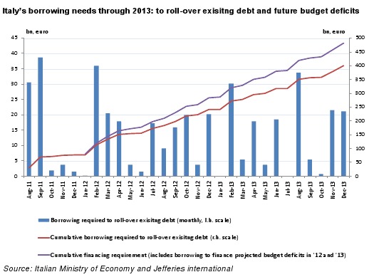 L’autore, David Owen, ha alcune certezze, prima delle quali legata proprio alla criticità del pagamento degli interessi sul debito da parte del governo italiano e alla dinamica della sua sostenibilità: con un aumento del costo medio del prezzo per il finanziamento tra i 200 e i 300 punti base, la nostra capacità di far fronte alle scadenze esploderebbe. Quest’anno, l’Italia avrà un deficit di budget del 4,75% e un avanzo primario dello 0,9% (escludendo i pagamenti degli interessi sul debito) sul Pil: stando a queste cifre, il governo del nostro Paese pensa di spendere 73 miliardi di euro per gli interessi sul debito da 1,5 trilioni (120% del Pil), dato che salirà a 85 miliardi nel 2014.