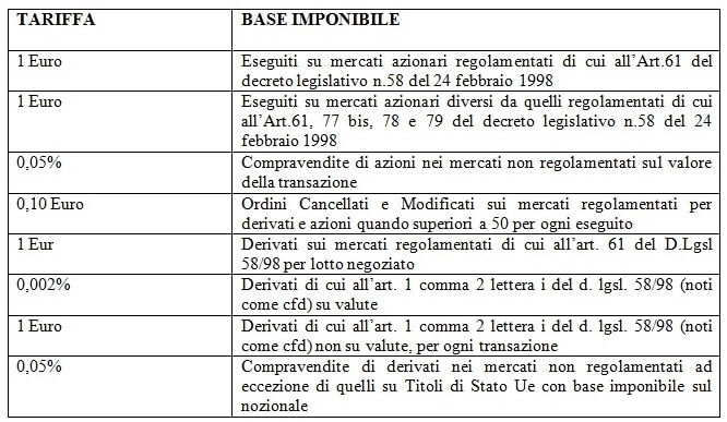 Art. 12, comma 18 – La compravendita di azioni, e di altri strumenti finanziari partecipativi emessi da società residenti nel territorio dello Stato è soggetta a imposta di bollo. La tariffa è pari a 1 euro per le compravendite effettuate nell’ambito dei mercati regolamentati. La tariffa è pari allo 0,05% del valore della transazione per le compravendita effettuate nei mercati non regolamentati. L’imposta è dovuta anche se la compravendita avviene al di fuori del territorio dello Stato. Gli ordini cancellati e modificati inoltrati nei mercati regolamentati sono assoggettati a un’imposta di bollo fissa di 0,10 euro a transazione laddove il risultato del rapporto fra il numero di ordini eseguiti e la somma del numero di ordini cancellati e modificati, in un’unica seduta di contrattazione, sia inferiore a 0,02.