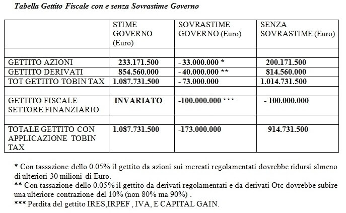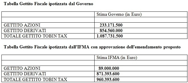 Secondo l’IFMA, le stime del governo appaiono ottimistiche, in quanto il gettito derivante dall’applicazione della tassa sul mercato azionario è stato calcolato non tenendo conto, per quanto concerne la base imponibile, dell’incidenza degli operatori che non pagheranno l’imposta secondo il disegno di legge di stabilità. Parimenti, il gettito del mercato dei derivati è sovrastimato e non tiene conto degli effetti che l’enormità della percentuale scelta (0,05%) avrà sul calo dei volumi. Un’ulteriore perdita si avrà sul gettito da azioni sui mercati regolamentati proprio per l’incidenza dell’aliquota (0,05%). Infine, non si tiene conto del mancato gettito prodotto da Ires , Irpef, Iva e Capital Gain ogni anno versati da operatori istituzionali, persone fisiche e aziende di intermediazione. Nella tabella sottostante viene quindi riportato il gettito “depurato”.