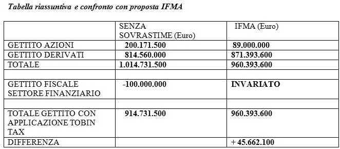 Come appare chiaro da quest’ultima tabella, la proposta dell’Ifma è persino in grado di aumentare il gettito “reale” dell’imposta. Non resta quindi che sperare, se l’intenzione è quella di introdurre la Tobin Tax, che venga vagliata e approvata.