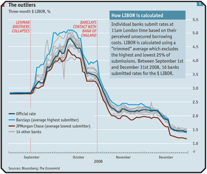 Secondo, Barclays, semplicemente, da sola non può aver manipolato il Libor. Per ottenere il risultato voluto, ovvero assicurare che il tasso sia fissato al prezzo richiesto, non basta soltanto stabilire il 25% più alto e più basso dei prezzi, ma anche assicurarsi che il rimanente 50% medio sia fissato al tasso voluto: essendo 16 le banche coinvolte nel processo di fissazione del Libor, almeno 13 devono essere state complici per ottenere il risultato voluto
