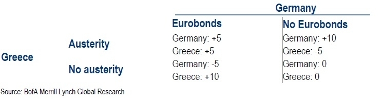 Come aiuto a meglio comprendere i tentennamenti tedeschi, non ci sono solo i numeri di salvataggi impossibili. C’è anche un’altra matematica, quella che studia i comportamenti umani di fronte a scelte che determinano un vantaggio o uno svantaggio. Questa matematica è conosciuta come “Teoria dei giochi”. Un interessante documento compilato da Bank of America – Merrill Lynch analizza la convenienza di alcuni paesi europei a rimanere o uscire dall’euro. La cosa interessante è che ha compiuto questa analisi utilizzando proprio la “Teoria dei giochi”, resa famosa dal film “A Beautiful Mind”. Il film racconta la storia del matematico premio Nobel John Nash, principale autore e studioso della Teoria dei giochi. Tale teoria viene utilizzata per verificare il comportamento decisionale di diversi soggetti (due o più) in un ambiente in cui vigono alcune regole e condizioni, insieme a informazioni note a tutti.