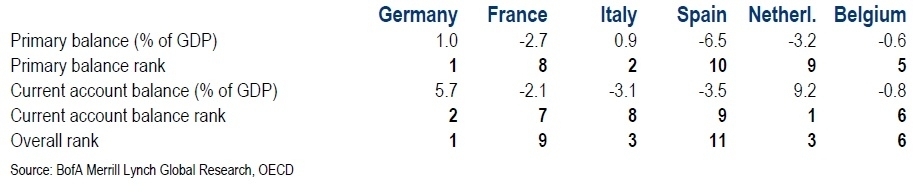 Nello studio di Bank of America, sono prima messe in paragone Germania e Grecia, con un dilemma paragonabile al dilemma del prigioniero; poi sono messi in paragone tutti i principali paesi dell’eurozona, nella ipotesi di una uscita dall’Euro. La prima analisi è riportata dalla prima figura.