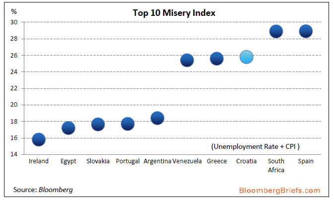 Guardate il grafico più in basso: rappresenta una sorta di classifica delle nazioni più “miserabili”, basato sulla misura convenzionale del cosiddetto “Misery Index”, che mixa tasso di disoccupazione e inflazione. Ebbene, la Spagna – il cui spread è fermo, è sceso di 250 punti base da luglio e i cui titoli vengono collocati con grande domanda e rendimenti in calo – raggiunge il 30%, peggio di Sud Africa, Grecia, Venezuela, Argentina ed Egitto! E Madrid ringrazi il cielo che il “Misery Index” non ha un calcolo a parte per il tasso di disoccupazione under-25! Va beh, a luglio entrerà nell’Ue la Croazia, la quale già sconta un tasso di partecipazione al mondo del lavoro del 50% e avrà, stando a proiezioni, una ratio debito/Pil del 63,6% nel 2017 dal 29,3% nel 2008, quando la crescita stagnava ovunque. Pochi mesi e toccherà a Zagabria la palma di miserabile! Ma cari lettori, c’è davvero poco da ridere.