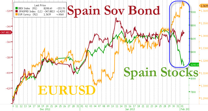 Trattasi, molto probabilmente, di figuraccia di una delle più grandi banche d’investimento del mondo, ma questo non deve farci stare più tranquilli: se chi ha venduto è riuscito a fregare BofA, Saipem ed Eni devono stare poco tranquilli. E il sistema Italia ancora meno. Anche perché, cari lettori, il redde rationem è alle porte. Guardate il grafico più in basso: vi pare sostenibile una dinamica debito-mercato azionario simile per un Paese completamente a pezzi come la Spagna? Siamo ormai alla correzione dei corsi, quella reale, legata ai fondamentali e che se ne frega delle promesse-minacce della Bce.