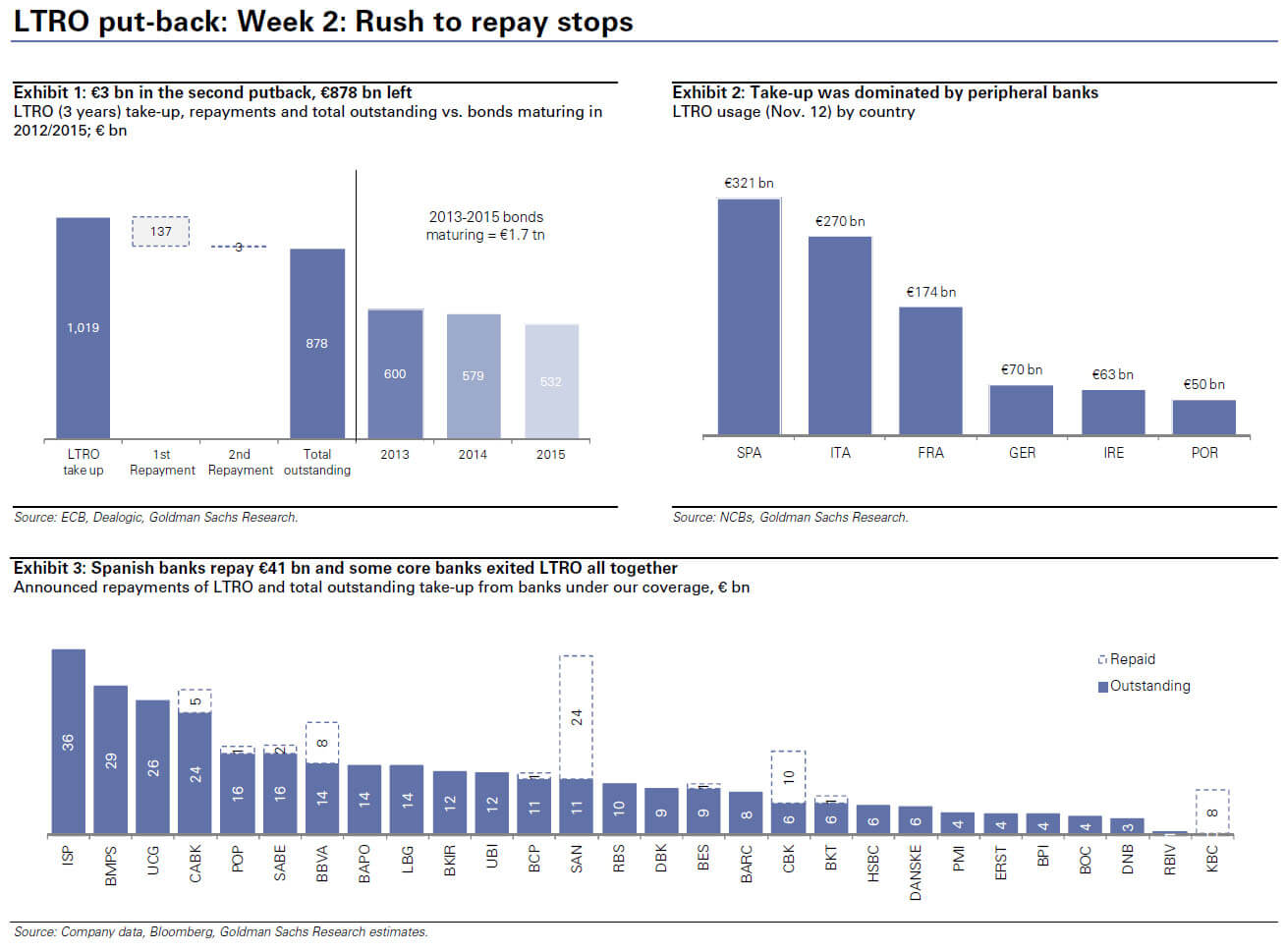 La Borsa di Milano, ieri, è stata un esempio chiaro di cosa stia succedendo. Al di là degli scandali a orologeria (guarda caso, mentre divampa la campagna elettorale in Italia esplode il caso Mps, noto anche ai sassi da anni e, sempre per coincidenza, guarda caso in Spagna scoprono i fondi neri del Partito popolare), ci sono dati chiari che parlano e fanno paura: i soldi della Bce sono andati, persi, già assorbiti dal sistema, il quale oggi lancia segnali inquietanti, basti guardare all’altro grafico: due venerdì fa le banche europee hanno ridato alla Bce 137 miliardi del triliardo preso in prestito all’1% con le aste Ltro, mentre venerdì scorso quanto hanno ridato? Solo 3 miliardi. Ne restano da ripagare 878, ma il problema non è questo, quanto il fatto che siamo alla vigilia di una nuova crisi di liquidità, innescata la quale soltanto il Signore sa come la Bce potrà intervenire, salvo espandere il proprio stato patrimoniale alle soglie dei 4 triliardi (cosa che la Bundesbank non permetterà facilmente).