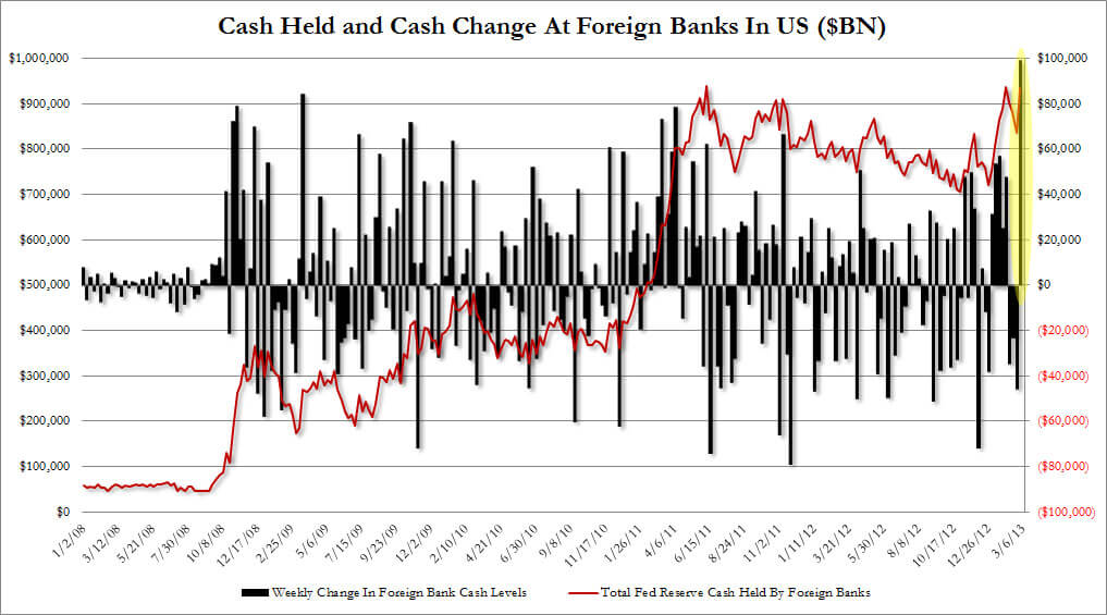 Ciò che l’IIF non dice, non perché siano più stupidi di me, anzi, ma perché non possono, visto che ne sono i beneficiari, è altro: se la Fed smette troppo presto con la liquidità, viene giù tutto. Eurozona e le sue banche, in testa. Eh già, sapete perché Draghi non cede ad alcuna sirena di allentamento monetario? Per vincoli di statuto? Per paura della Germania? No, perché la liquidità necessaria alle banche europee per stare in piedi la sta fornendo la Fed! Nella settimana terminata il 27 febbraio scorso, la Fed ha infatti iniettato il record di 99 miliardi di dollari di riserve in eccesso presso banche straniere, quasi tutte europee. Basta guardare i numeri del comunicato H.8: “Il totale è passato da 836 miliardi al quasi record di 936 miliardi, con una “riallocazione” in forma di contante presso le banche straniere di 99,3 miliardi in una settimana”. Basta guardare questi due grafici, capaci di spiegare la dura realtà meglio di mille parole.