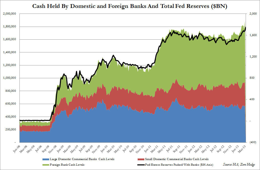 Inoltre, dei quasi due triliardi (1,884) di contante parcheggiato dalla Fed presso banche Usa e straniere, solo 949 miliardi sono depositati in istituti statunitensi. L’altra metà, 936 miliardi, sta tutta in banche straniere operanti negli Usa, la gran parte europee (l’area verde del secondo grafico).