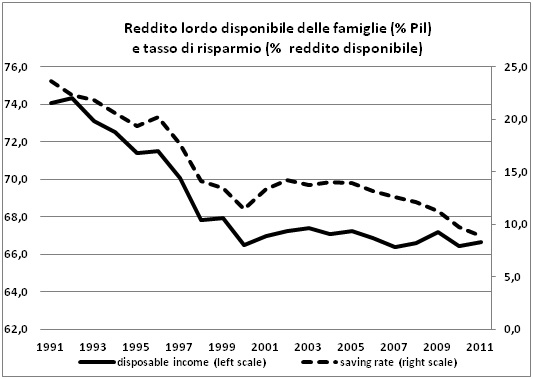 Fra il 1991 e il 2011 la quota di risparmio delle famiglie rispetto al Prodotto interno lordo è diminuita di ben 7,4 punti (scala di sinistra), mentre il tasso di risparmio è diminuito di 14,8 punti (scala di destra): nel 2012 il Pil è diminuito del -2,4% e i consumi finali nazionali del -3,2%, nonostante le esportazioni siano aumentate. Si è registrata perciò un’ulteriore flessione nei valori citati, ancora da quantificare.