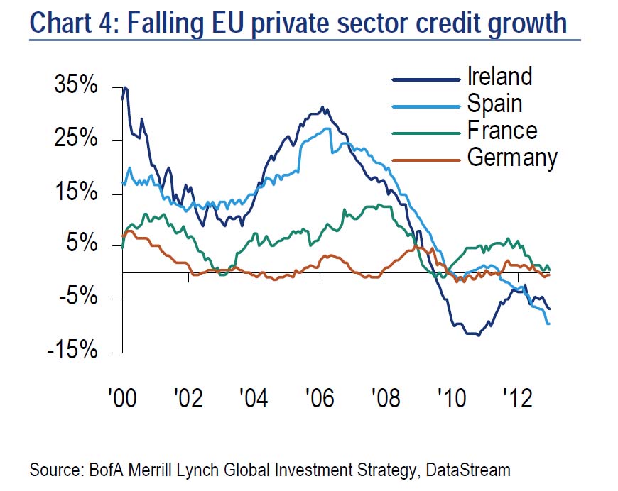 Inoltre, c’è un secondo problema: come mostra il grafico a fondo pagina, in Europa la creazione di credito nel settore privato è morta, è negativa anche in Germania. Quindi, per molti l’unica opzione per sbloccare quegli assets diciamo “problematici” e bypassare la creazione di credito nel settore privato è che la Bce faccia come la Fed o la Bank of Japan, ovvero monetizzi gli assets, creando crescita del credito dal nulla. Lo farà la Bce? Non finché alla Germania farà comodo stare nell’euro. E certamente non prima dell’esito del voto tedesco di settembre.