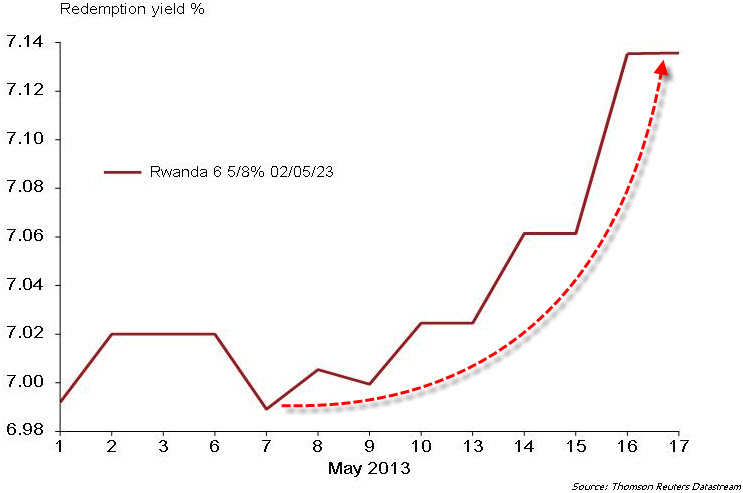 Il Giappone si sta comportando come chi lancia un’atomica in un lago per far venire a galla i pesci: per un po’ si mangia, ma finito il pesce presente al momento della detonazione non si mangia più perché l’ambiente è devastato. Bene, Tokyo sta facendo correre questo rischio a mercati già marci e sopravvalutati, a fronte di dati macro mondiali da mani nei capelli. Ricordate il bond decennale del Ruanda, quello emesso a inizio mese e che pagava solo il 7% di rendimento, come la Spagna la scorsa estate? Bene, guardate il movimento dello yield nelle ultime settimane: è in svendita, nemmeno i soldi di Abe convincono fino in fondo i mercati che tutto è buono se offre un rendimento. Chissà che i cantori di Abe e della Bank of Japan soggiogata alle politiche espansive non provino a dare un’occhiata critica alle conseguenze, invece che trincerarsi dietro quel dato di crescita del 3,5% e gridare al miracolo.