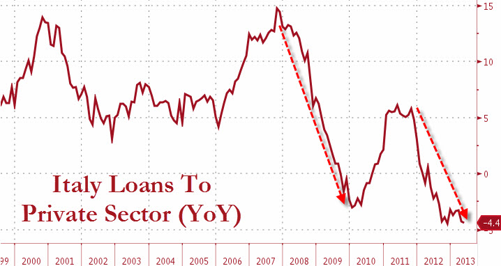 Attualmente le nostre banche hanno in portafoglio circa 370 miliardi di titoli di Stato italiani e l’ultimo bollettino della Banca d’Italia certificava che all’aumento dei depositi presso le banche italiane corrispondeva un’ulteriore contrazione degli impieghi nel mese di maggio, -2,4% annuo complessivo per i prestiti al settore privato, giunto nel suo insieme al livello più basso dal picco della primavera 2010, come ci mostra questo grafico.