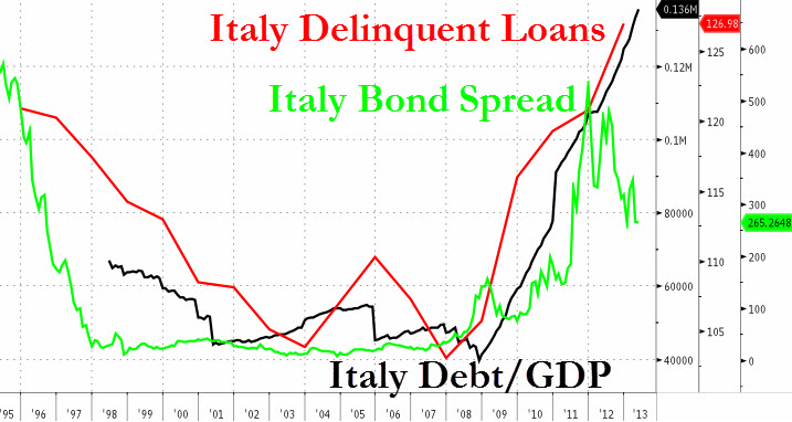 Senza questo “doping” – che come ci ha fatto capire Bernanke potrebbe finire o rallentare, mentre la Bce non ha nemmeno gli strumenti legali per acquistare bond sovrani attraverso il programma OMT – e prendendo per buona la correlazione di quella traiettoria tendenziale quasi sempre rispettata nel tempo, l’attuale spread italiano non sarebbe attorno ai 290-300 punti base com’è, ma già in area 650-660, ovvero più alto di quando sul finire del 2011, Silvio Berlusconi si dimise facendo spazio a Mario Monti.