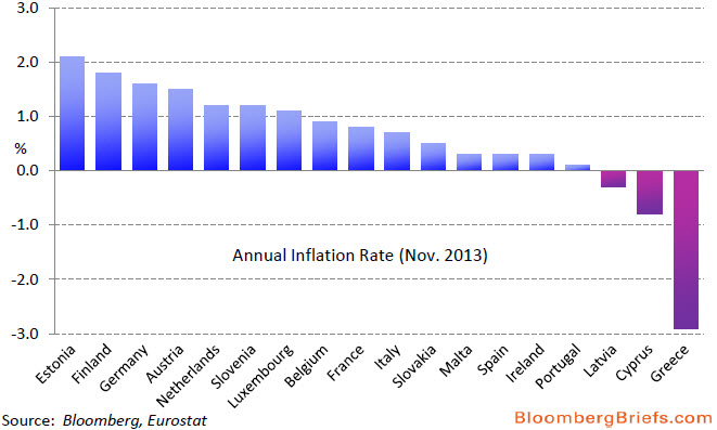 E sapete perché? Perché nonostante Barroso e Nowotny, sono già tre gli Stati in deflazione conclamata: Grecia, Cipro e Lettonia. L’economia greca è entrata in trend deflazionistico nel marzo 2013 e non si è mai ripresa, tanto che nel mese di dicembre i prezzi al consumo armonizzati Ue sono scesi dell’1,8%, la più lunga striscia deflazionistica dal 1968 e la peggiore da quando Bloomberg raccoglie i dati al riguardo. Basta guardare questo grafico. A oggi, l’economia greca è ancora più piccola del 21,3% rispetto a quanto fosse nel terzo trimestre del 2007, ma nonostante questo i titoli azionari greci sono saliti del 19% negli ultimi nove giorni, ai massimi da tre anni. È come vi dicevo ieri rispetto al trend della Borsa italiana: c’è un progetto di fondo, finanziarizzare la politica, scollegare finanza ed economia reale. I paesi muoiano di riforme e austerity, le banche macinano soldi su soldi. E dettano l’agenda ai politici fiancheggiatori di turno.