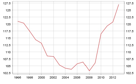 Ecco qui sotto il grafico, tratto dal sito ufficiale della Bce, sul debito pubblico italiano in rapporto al Pil. L’ultimo tratto di salita, quello più ripido, è quanto accaduto durante il governo Monti. I dati non sono aggiornati, perché si fermano al 2012. Ma noi già sappiamo che il rapporto debito/Pil è arrivato al 133%, quindi quella linea ripidissima ha proseguito la sua salita. Anche perché il governo Letta non ha fatto che confermare e proseguire l’opera del governo Monti.
