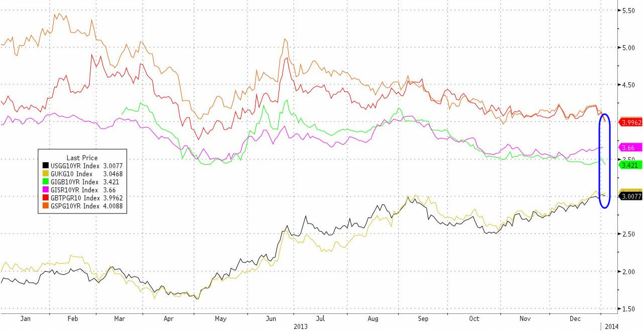 Dunque, come mostra plasticamente e ufficialmente il grafico a fondo pagina, Italia e Spagna sono entrate a far parte del club del 3%, ovvero di quei paesi i cui titoli di Stato decennali prezzano rendimenti nel range del 3%. Sono Stati Uniti al 3,008%, Regno Unito al 3,044, Irlanda al 3,389%, Israele al 3,70%, Spagna al 3,91% e Italia al 3,95%. L’anno scorso lo spread tra Stati Uniti e Spagna era a 350 punti base, oggi meno di 90. In un giorno il nostro spread e quello spagnolo si sono compressi di 18 punti base, quello portoghese addirittura di 30. Sembra l’inizio anno del 2013, ma quelli sono livelli del luglio 2011: cosa sia successo dopo in entrambe i precedenti, è cosa nota. Ma voi sentite di stare meglio? Oppure siamo al punto di prima ma Bce e banche ci illudono comprando bonds come se non ci fosse un domani, facendo fare un figurone al governo Letta, il quale dovrà poi ridare qualcosa in cambio?
