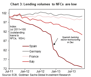 L’ineluttabilità di quanto sta per accadere a Francoforte è figlia naturale di tre cose: primo, il timore, anche tedesco, di un’ondata euroscettica al voto europeo di maggio, fatto che impone un allentamento della cinghia per evitare che i cittadini vedano in Bruxelles unicamente una matrigna. Secondo, la Francia che si sta schiantando. La seconda economia europea, infatti, è completamente ferma, ha il tasso di disoccupazione ai massimi dagli anni Settanta e veda la grande impresa, il suo vanto e motore assoluto, nei guai fino al collo. Ieri la riprova, quando l’Associazione dei costruttori di autoveicoli ha certificato che il mercato dell’auto transalpino è sceso ai livelli più bassi da 15 anni a questa parte, con solo 1,79 milioni di nuove auto vendute nel 2013, -5% dall’anno precedente. Terzo, due aste di sterilizzazione fallite negli ultimi quindici giorni senza che il mercato crollasse significano solo due cose: o Ltro già prezzato o il fatto che gli investitori diano per probabile che d’ora in poi la Bce acquisti titoli di Stato senza dover sterilizzare, ovvero aumentando lo stato patrimoniale come la Fed e dando vita a un quantitative easing in piena regola. Ecco fatto, gli spread italiano e spagnolo sono in forma smagliante senza che un solo dato macro sia in effetti migliorato davvero (a meno che voi non vogliate credere davvero che il tasso di disoccupazione spagnolo a dicembre sia sceso del 2,24% rispetto a novembre, perché in quel caso il passo successivo è credere a Babbo Natale. Come lo so? Guardate il grafico a fine pagina: quella linea che crolla sono i prestiti alle imprese non finanziarie da parte delle banche spagnole, le quali nel mese di dicembre hanno anche dato vita a una ristrutturazione in vista della supervisione unica. Senza credito alle aziende, come si crea occupazione? Tutti assunti da banche, finanziarie, hedge funds e centri studi economici quegli spagnoli che hanno trovato lavoro? Andate a raccontare balle altrove, per favore).