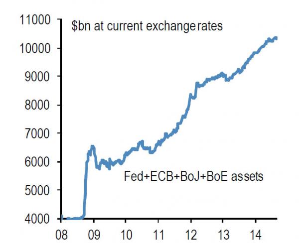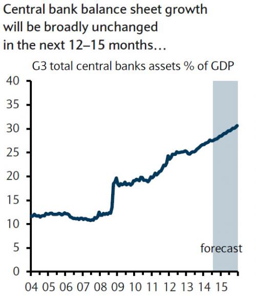 Prendiamo ora l’ultimo grafico: con il timore diffuso che la Fed possa davvero ritirare il su programma di stimolo, innescando una contrazione al trend della liquidità, questa previsione elaborata da Barclays ci indica che almeno fino al 2016 «non cambierà assolutamente nulla nell’inclinazione dell’eccesso di liquidità fungibile e globalmente interconnesso, visto che la crescita dei bilanci delle banche centrali resterà ampiamente invariata per i prossimi 12-15 mesi».