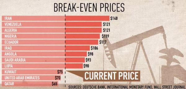 Poi, il colpo politico, affidato al ministro del petrolio nigeriano, per il quale «i paesi non Opec devono condividere il peso del mercato petrolifero», smentendo che l’Opec stia giocando sporco. Come dire, visto che gli Usa grazie allo shale oil ora sono il principale produttore del mondo, comincino loro a tagliare e noi ci accoderemo. Il perché di così differenti reazioni è spiegato alla perfezione da questo grafico, che ci mostra i punti di break-even fiscale sul prezzo del barile di cui necessitano i vari stati per mantenere i budget in equilibrio. Ora capite la rabbia iraniana (contenuta) e venezuelana (esplicita).