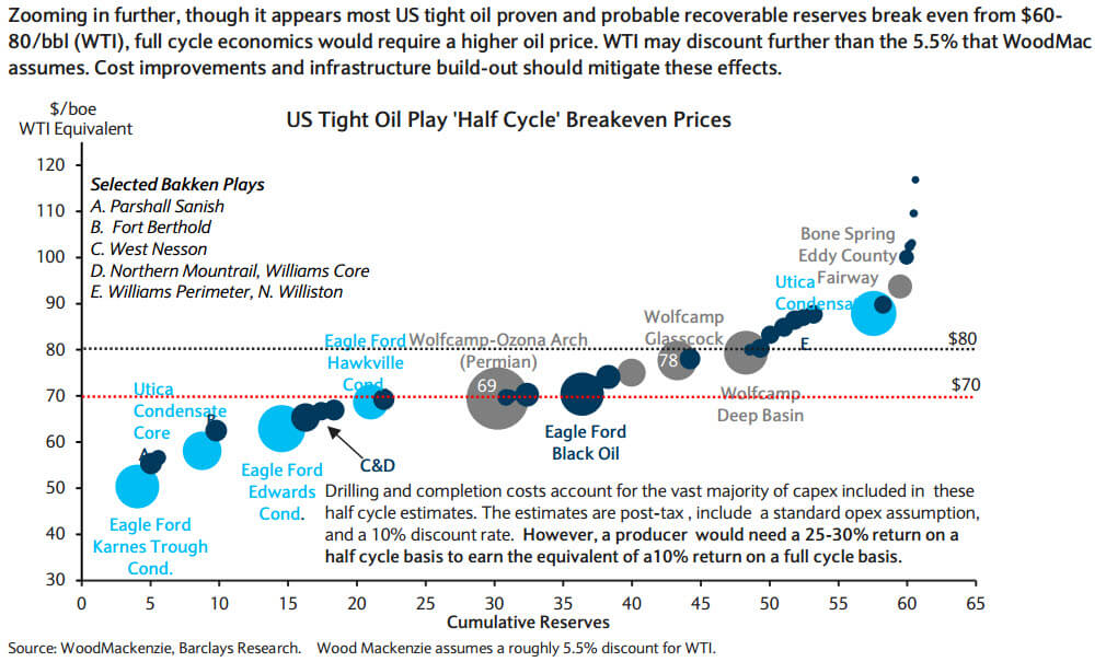 E non pensate che sia propaganda, ce lo dimostrano i due grafici a fondo pagina che ci spiegano, da un lato, come il ciclo del break-even per lo shale gas sia già oltre la metà e che quindi necessita di un aumento dei prezzi e, dall’altro, come già oggi alcuni degli impianti di trivellazione Usa siano sotto pressione per i costi di produzione che non riescono a fare offsetting con quello del barile a livello di break-even. E ce lo conferma anche Daniel Dicker, presidente della MercBloc Wealth Management Solutions, un uomo con 25 anni di esperienza al Nymex di New York dove trattava proprio contratti sul petrolio: «Tutti quanti stanno provando a impressionare il mercato con la loro abilità a gestire il prezzo del petrolio a 80 dollari, ma la maggior parte di loro sta vendendo solo fumo. La rivoluzione dello shale non funziona a 80 dollari, punto». E già ieri, siamo andati sotto i 70 dollari, esattamente a un minimo intraday di 67,75 dollari, un downside da panico ma con un forte appeal psicologico.