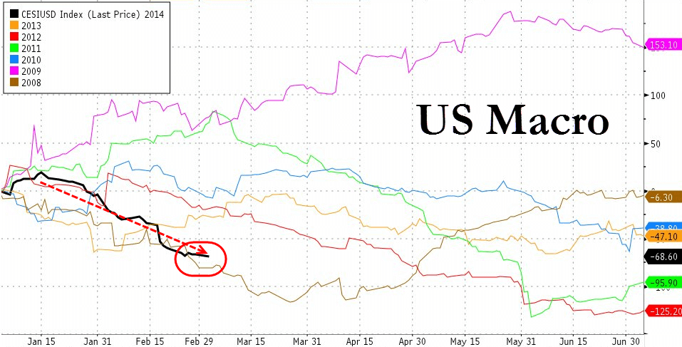 Il secondo ci giunge dritto dritto da niente meno che Goldman Sachs, il cui February Final Global Lending Index ci parla di un ciclo industriale globale in fase di rallentamento, con un momentum positivo ma in decrescita. Pur restando pacatamente ottimista, Goldman non solo sposa la vulgata del “blame the weather” per giustificare il rallentamento, ma è costretta ad ammettere, come dimostra il grafico a fondo pagina, che l’indice macro Usa da inizio anno a oggi è il peggiore dal 2008.