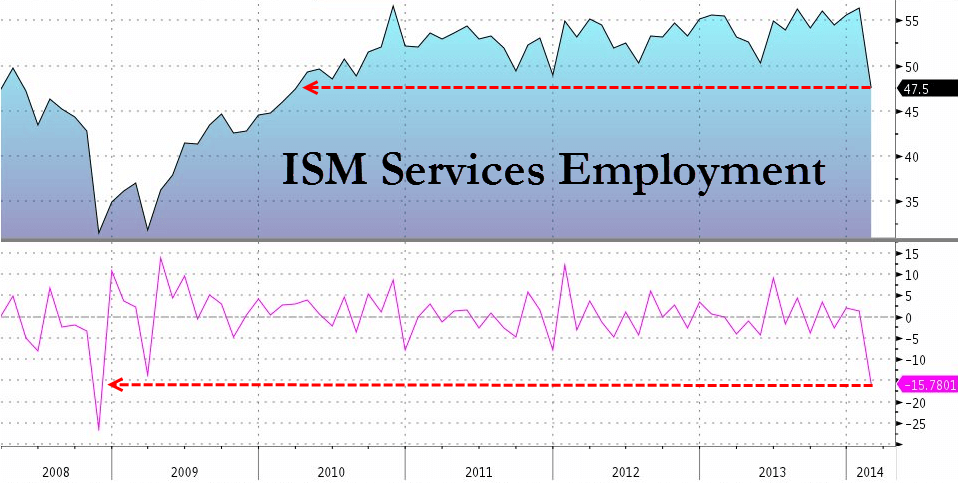 Terzo, è di ieri la notizia del collasso dell’indice Ism Services, sceso a 51,6 contro le attese di 53,5, in netta contraddizione con il recente aumento (non poco sospetto) dell’indice manifatturiero. Inoltre, il sub-indice dell’occupazione è letteralmente crollato a 47,5 da 56,4 (massimo da novembre 2010), il peggior dato dal marzo 2010 e il tonfo peggiore dal fallimento di Lehman Brothers, come dimostra il secondo grafico a fondo pagina. Insomma, l’occupazione – vera dinamo del “taper” – non riparte. Anzi, scende ai minimi da quattro anni.