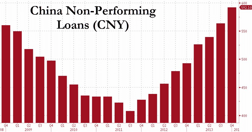 Il costo del denaro continua a salire, frutto della contrazione del credito e della liquidità voluta dal governo e oggi le aziende cominciano a fare i conti con l’uso a volte dissennato fatto dei 4 triliardi di yuan di stimolo all’economia liberati dal governo a partire dal 2008, quando molte ditte investirono pesantemente in progetti competitivi ma poco profittevoli, poiché potevano contare su facilità illimitata di finanziamento: ora, con pochi ricavi e progetti spesso non performanti, la scarsità di credito morde. Ed emerge con tutta la sua forza il problema iniziale: quanto debito può assorbire la Cina, stante la ratio già attuale dei crediti non performanti, come ci mostra il grafico a fondo pagina?