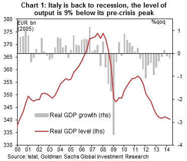 L’economia italiana torna quindi a contrarsi per la terza volta in cinque anni. Dopo quella del 2008-2009, la breve ripresa del 2010, poi la recessione interrotta fino al terzo trimestre del 2013 e nel quarto la ripresina (+0,1%). Ora il cosiddetto “triple dip”, il terzo tuffo nella recessione, dopo che nel primo trimestre di quest’anno l’economia nazionale ha visto una contrazione dello 0,1% sui tre mesi precedenti e dello 0,5% sull’analogo periodo dell’anno precedente.