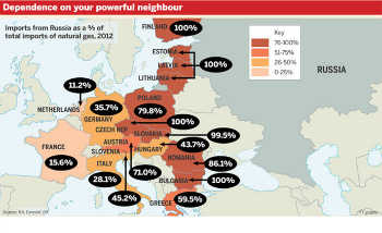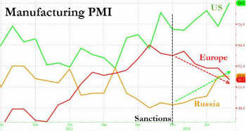 Ci mostra la dipendenza dei Paesi europei dall’export russo come percentuale delle necessità totali di gas naturale. Con il suo 35,7%, la Germania è certo messa meglio di molti Paesi dell’Est praticamente dipendenti in toto dall’import ma è comunque una percentuale importante, soprattutto se la ripresa dovesse attivarsi e il comporto industriale riprendere forza dopo l’attuale livello di recessione: sicuri che queste sanzioni, ancora una volta, non siano solo un boomerang a tutto detrimento dell’economia europea e a tutto vantaggio di quella Usa? Questo grafico, che vi ho già proposto, merita proprio di essere ripubblicato, a futura e imperitura memoria della nostra stoltezza.