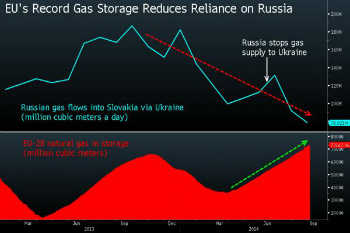 La linea blu ci mostra i flussi medi giornalieri di gas che transitano a Velke Kapusany, sul confine tra Ucraina e Slovacchia, principale punto di passaggio del gas dalla Russia all’Ue: come vedete, nell’ultimo mese ha subito un crollo record, stando a dati dell’operatore slovacco Eustream AS, che parla di livelli tornati al 2011. L’istogramma rosso, invece, ci mostra il volume record di gas pompato dai 28 Paesi nei loro siti di stoccaggio, livelli mai toccati stando al gruppo Gas Infrastructure Europe di Bruxelles, pari al 92% di disponibilità massima dei siti di stoccaggio slovacchi.