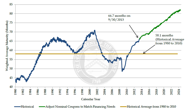 Lo scorso anno, l’ammontare lordo del debito detenuto dal governo federale era circa 5,5 volte il gettito fiscale, l’equivalente di qualcuno che guadagna 30mila dollari l’anno avendo un debito detenuto di 165mila dollari. Guardate questo grafico: ci mostra la media ponderata della scadenza del debito federale Usa in circolazione e come possiamo notare lo scorso anno questa media era di 5,5 anni.