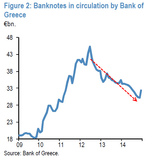 Stando a dati diffusi domenica sera da JP Morgan, infatti, nella settimana precedente al voto di domenica dalle banche greche sono stati ritirati nientemeno che 8 miliardi di euro, più di tutti gli outflows di dicembre e del resto del mese di gennaio insieme! Il tutto in un quadro da mani nei capelli per le banche greche, con l’Istituto centrale del Paese che nel mese di dicembre ha visto espandersi significativamente lo stato patrimoniale, avendo preso in prestito dalla Bce 11 miliardi di euro e portando il totale a 57 miliardi. Peccato che nello stesso mese gli outflows furono di “soli” 3 miliardi di euro, quindi i dati di gennaio ci parleranno di ulteriore denaro in arrivo da Francoforte non solo per tamponare le fughe di capitali, ma anche per ridurre l’accesso della Grecia ai mercati repo, come accade prima e durante la prima crisi. Certo, in dicembre le banche greche hanno preso in prestito solo 1 miliardo tramite il fondo di emergenza Ela e, stando al collaterale posto a garanzia di 23 miliardi, anche calcolando un haircut del 50% sui credit claims, in gennaio potranno ottenere almeno altri 10 miliardi, ma si tratta sempre di metadone e a tassi che non sono certo quelli della Bce. Tanto più che l’acquisto di fondi monetari offshore, leggi lussemburghesi garantiti dal buon Juncker, la scorsa settimana è salito alle stelle, con un totale di 206 milioni di euro tra lunedì e giovedì comparati ai soli 91 milioni della settimana tra il 9 e il 16 gennaio, i 54 della settimana tra il 2 e il 9 gennaio e i 107 totali per l’intero mese di dicembre. Insomma, se la cifra di 3 miliardi di outflows di depositi per il mese di dicembre è reale e quegli acquisti su mercati offshore rappresentano un buon proxy per le fughe di capitali, dobbiamo aspettarci che gli outflows di depositi saranno attorno ai 4 miliardi per le prime due settimane di gennaio più gli 8 miliardi della sola scorsa settimana.