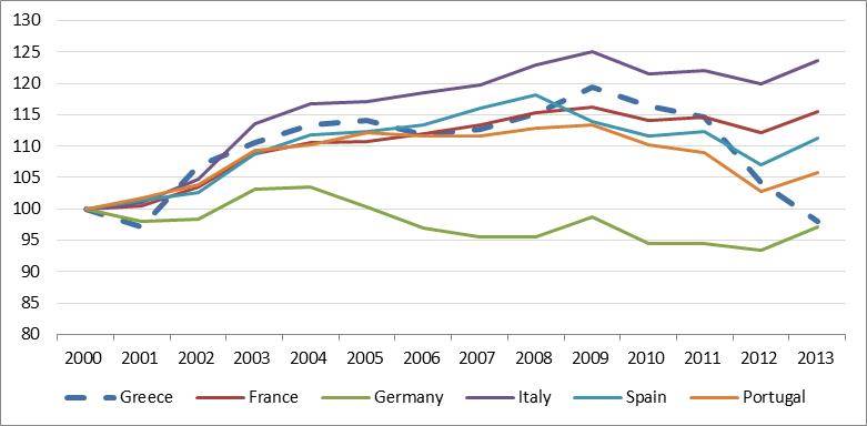 Il tasso reale effettivo di cambio è una media ponderata della valuta di un Paese nei confronti di un indice o paniere di altre maggiori monete al netto degli effetti dell’inflazione: se questo si apprezza, i beni e servizi dei quella nazione diventano più cari sui mercati internazionali e, quindi, per evitare di perdere quote di mercato si può cercare di svalutare la propria moneta per operare l’offsetting sul differenziale più alto dell’inflazione domestica. Parlando dell’eurozona, però, sono solo i differenziali dei livelli di prezzo a interessare, visto che la valuta nominale è la stessa tra tutti i partner commerciali: in parole povere, per migliorare la propria competitività, ogni Stato membro non può ottenere alcun aiuto dal tasso di cambio ma solo dall’abbassamento dei costi. Qual è quindi il problema greco, il “G-factor”? Semplicemente, una critica caratteristica dell’economia greca è stata enormemente sottovalutata. Guardate il primo grafico a fondo pagina, ci mostra l’evoluzione del tasso reale effettivo di cambio in un gruppo di nazioni dell’eurozona a partire dal 2000. Fino al 2009, la Grecia era seconda solo all’Italia – ebbene sì, ora capite tante cose vero? – per livello di apprezzamento del tasso reale effettivo di cambio, una sopravvalutazione particolarmente netta soprattutto nei confronti della Germania – ma guarda un po’ -, la quale invece durante quel periodo era in modalità deflattiva sul cambio, a tutto beneficio dell’export.